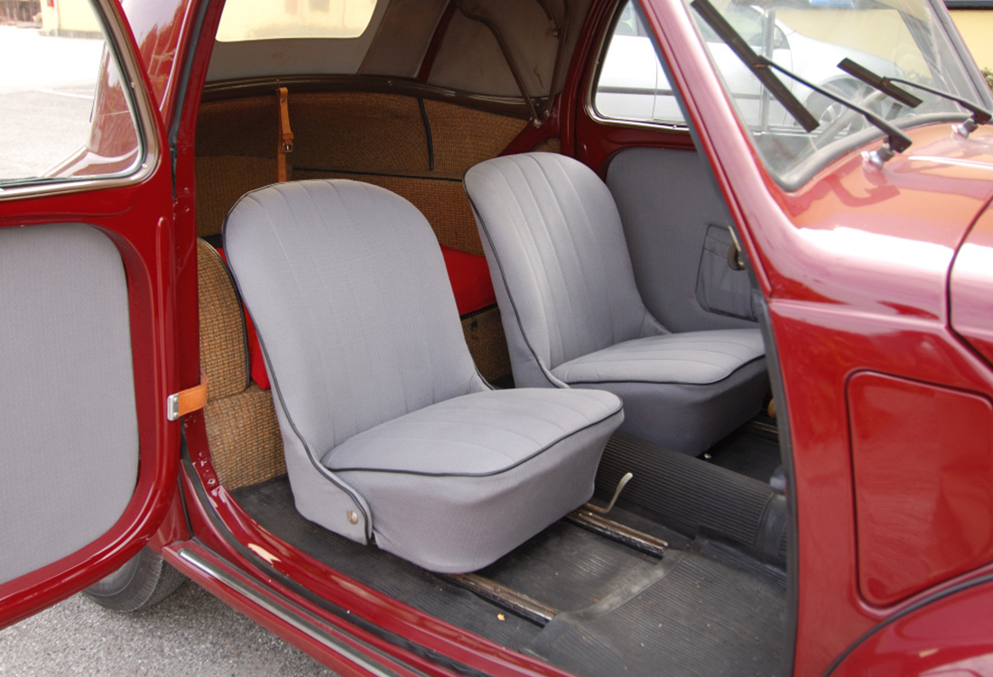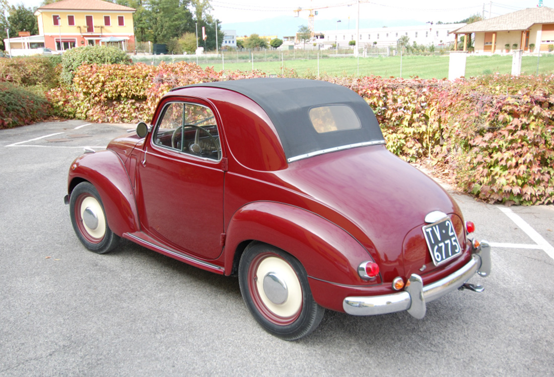 Berlina Marca: Fiat Modello: Topolino C Anno produzione: 1953 Motore: 4 cilindri Alimentazione: Benzina Cilindrata:569 cc Cavalli: 16.5 hp Giri motore: 4.000 rpm Cambio: 4 marce + r Velocità: 90 km/h